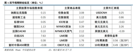 国庆中秋假期全球主要股指和商品价格普遍上涨,其中日本股市、国际铜价涨幅最大,港股先涨后跌,涨幅较小。美国政府关门扰动、未来降息和衰退的预期使得全球投资者对美元信用和美国主权债务的担忧进一步上升,这推动了金银等贵金属和比特币价格进一步走高。与此同时,供给短缺和算力革命逻辑下,铜价近期也明显走强。建议关注金银铜等有色板块投资机遇。