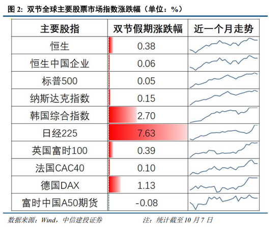 国庆中秋假期期间(统计截至10月7日)全球主要股票市场指数普遍上涨,其中恒生指数在10月2日大涨1.61%,但之后几个交易日略有回落,主要受到日本股市大涨下流动性冲击的影响。日经225指数假期大涨7.63%,主要源于高市早苗基本锁定日本首相之位,投资者押注更积极的财政扩张与日本央行更缓慢的加息步伐。美股方面,AI继续推动美股科技股走强,不过10月7日甲骨文被爆云利润率逊色,引发大型科技及消费股的抛售,从而拖累美股大盘。