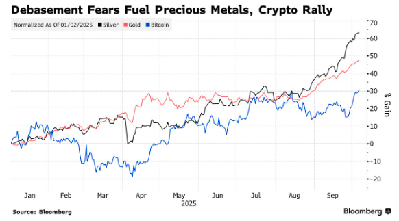 摩根大通策略师团队上周发布的数据显示,随着散户投资者同时买入黄金和比特币交易所交易基金,“货币贬值交易”在第三季度加速,且自去年最后三个月以来已获得“显著动能”。摩根大通策略师指出,比特币ETF资金流入在特朗普总统4月2日宣布加征关税后加速,持续至7月;黄金ETF资金流入则自8月起加速追赶,与比特币ETF的差距正在缩小。