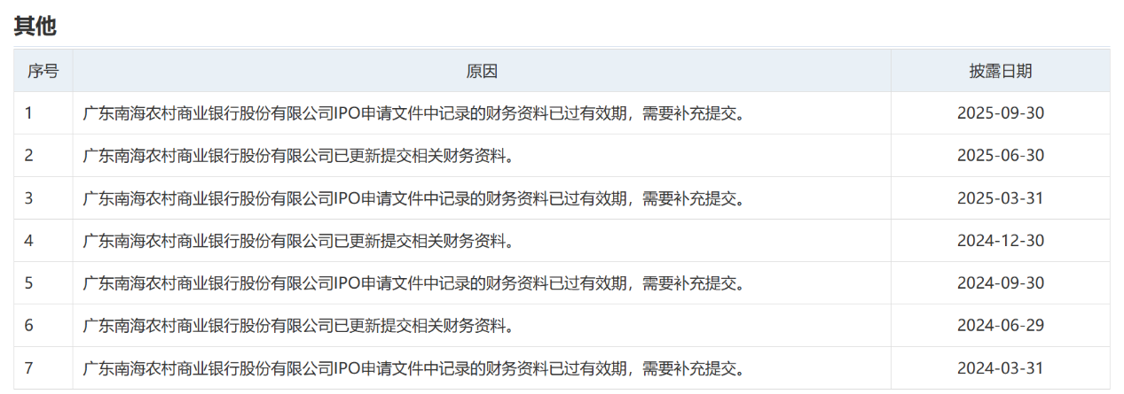 值得注意的是,这已是东莞银行与南海农商行IPO审核在2025年内第二次进入“中止”状态。回溯历史披露信息,两家银行多次因财务资料有效期问题陷入“中止—更新提交—再中止”的循环:从时间线来看,东莞银行在2024年3月、9月,2025年3月、9月均因财务资料过期需补充提交,后续也多次完成资料更新;南海农商行的状态变化规律与东莞银行高度一致,同样在2024年3月、9月及2025年3月、9月因财务资料有效期问题经历“中止”,并在之后完成相关财务资料的更新提交。