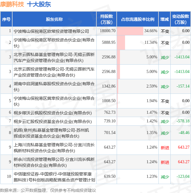 正文 10月9日康鹏科技发布公告,股东减持490.17万股 21资料 V管理员 /2025-10-09 20:55:18 /0 评论 /3 阅读 1009 证券之星消息,10月9日康鹏科技发布公告《康鹏科技:关于持股5%以上股东权益变动至5%的提示性公告》,其股东无锡云晖新汽车产业投资管理合伙企业(有限合伙)于2025年9月29日至2025年9月30日间合计减持490.17万股,占公司目前总股本的0.9438%,变动期间该股股价上涨1.4%,截止9月30日收盘报8.68元。 股东增减持详情见下表: 根据康鹏科技2025年中报公布的十大股东详情如下: