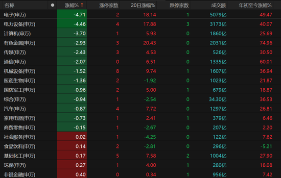 电子、电力设备、计算机、有色金属、传媒、通信、机械设备、医药生物等板块领跌。个股方面,寒武纪-U收跌6.43%报1247.08元/股,海光信息跌幅超过8%;阳光电源跌近8%,亿纬锂能(维权)跌近11%;当虹科技跌幅超过11%,浪潮信息、虹软科技跌幅均超过8%;紫金矿业跌近5%;国盾量子收跌9.72%,中天科技、润泽科技、世嘉科技跌幅均超过7%。