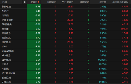 板块跌多涨少,多个热门赛道出现较大回调,锂矿概念、半导体、AI(人工智能)芯片、电源设备、贵金属均大跌。而水泥、啤酒、燃气等传统股逆势护盘。