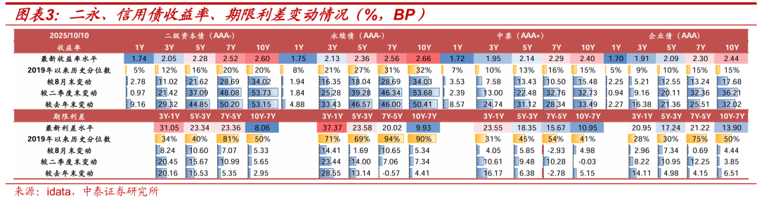 1)利率债长端回调幅度大于短端,曲线走陡,长端利差走阔,5Y-3Y利差收窄。截至10月10日(下同),30Y国债收益率较8月末调整14.5BP,1Y国债收益率基本不变,同期30Y-10Y国债期限利差回至2019年以来45%历史分位数,利差走阔至44BP左右。