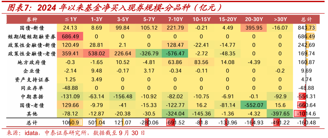 而这些期限、品种基本上是基金偏好的重仓券。从现券交易情况看,除短融外,2024年以来基金偏好净买入7-10Y利率债、20-30Y国债、1-5Y中票以及7-10Y二永品种。