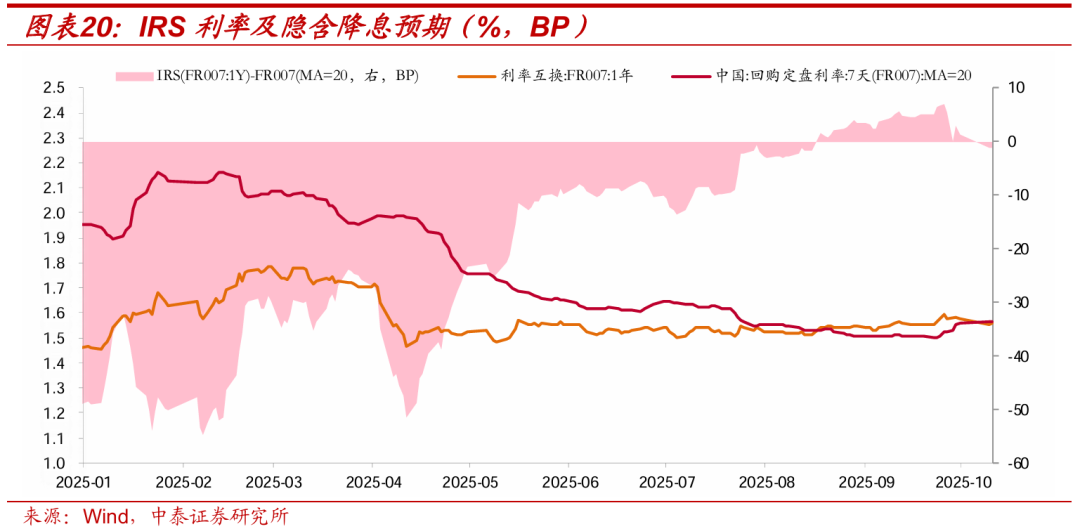 目前IRS隐含降息预期表现较低。用“IRS(FR007:1年)- FR007(20日MA)”衡量市场预期对降息的定价程度,年初及4月关税事件落地两个时间节点,隐含降息预期一度扩大至50BP,4月以来降息预期持续收窄,8月18日后指标表现转正,近期出现下滑,但目前基本无隐含降息预期。