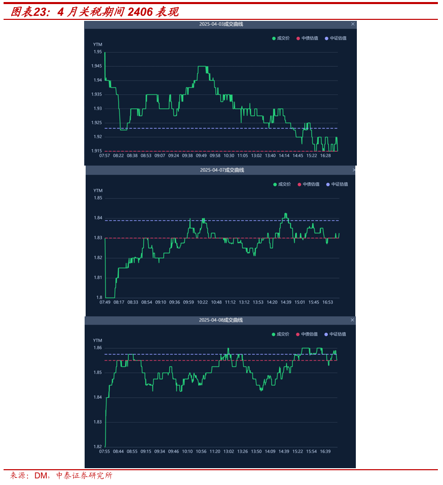 复盘今年4月3日,2406全天下行7.75BP, 4月7日早盘低开10bp到1.8%,随后波动上行至1.8325%,两日下行约16BP,而后4月8日低开在1.82%,但盘中一路上行到收盘1.855%,整体来说,三个交易日内基于关税的债券交易基本结束,而后整个4月回到了“垃圾时间”。