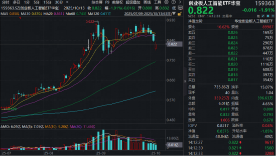 热门ETF方面,同类规模最大、流动性突出的创业板人工智能ETF(159363)盘中触及5%跌幅,现跌幅收窄至2.86%,实时成交额超5亿元。