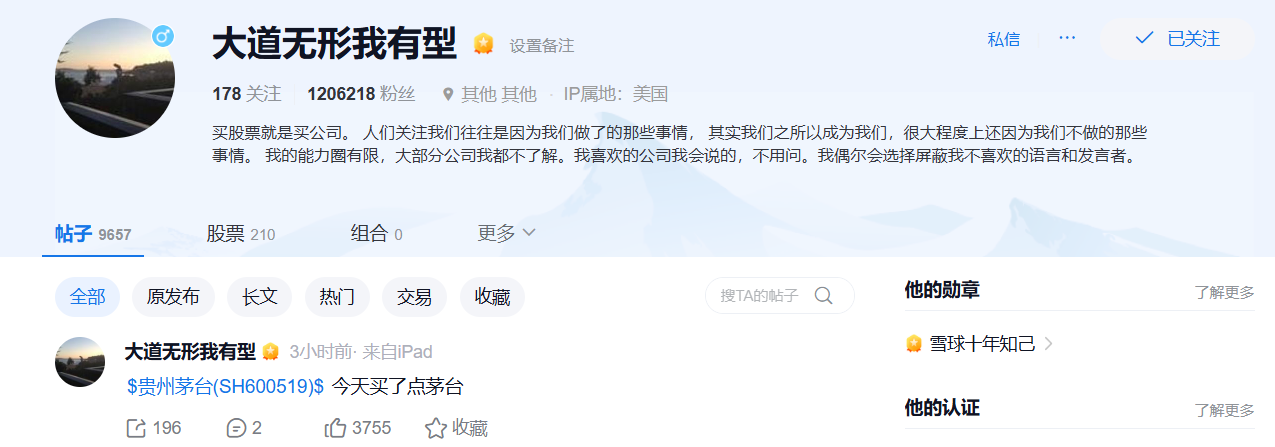 10月13日,知名投资人段永平在其账号“大道无形我有型”的主页上表示:“今天买了点茅台。”