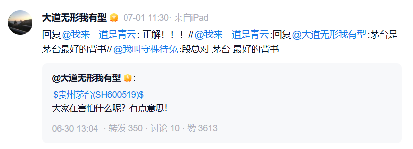 随后,有网友表示,“茅台是茅台最好的背书。”对此,段永平回复“正解”二字,以表认同。
