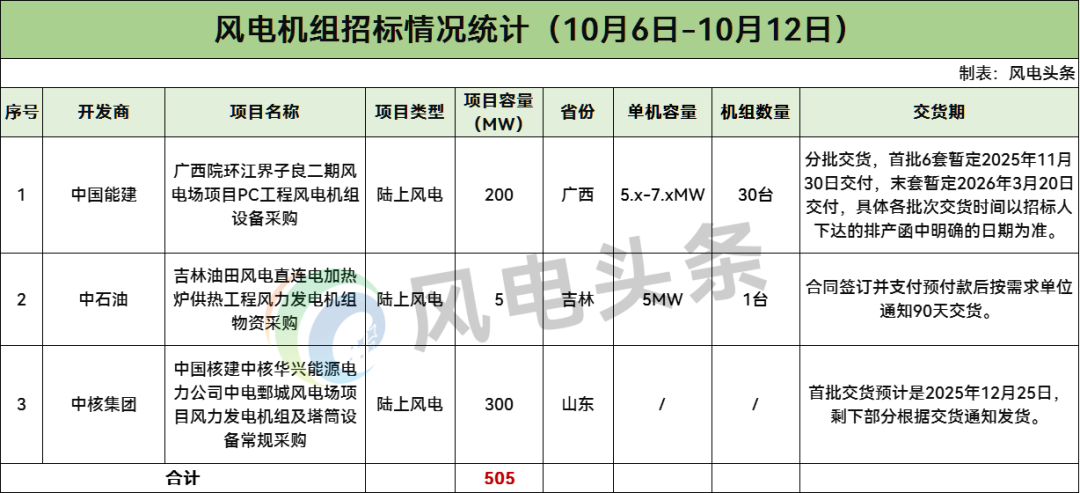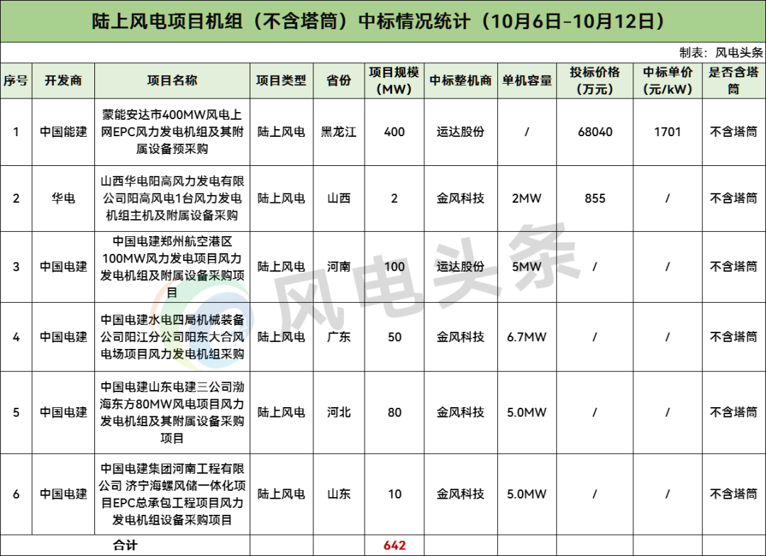 据风电头条统计,10月6日-10月12日风电整机采购开标总计1242MW,风电机组招标总计505MW;风电塔筒开标总计1000MW。