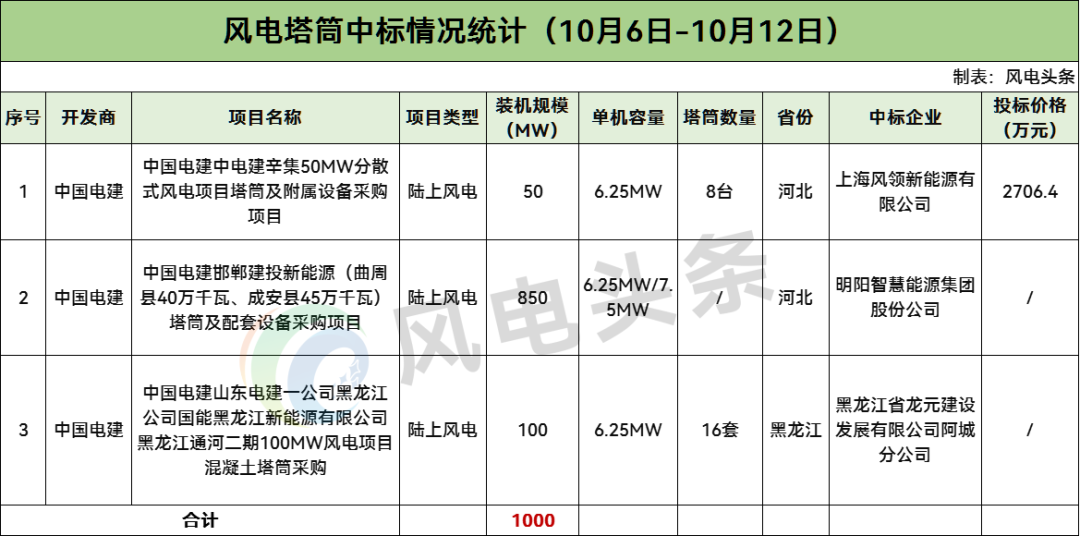 据风电头条统计,本周有3个陆上风电项目塔筒采购开标,规模为1000MW,开发商为中国电建。