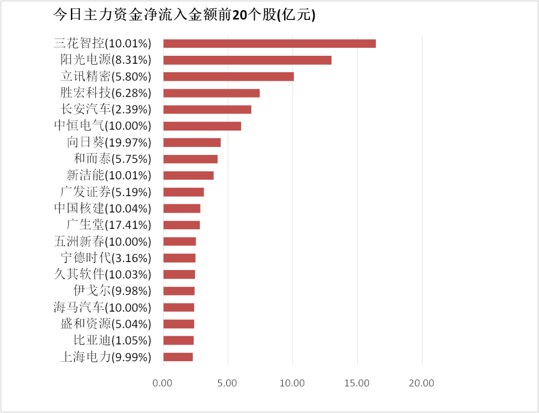 申万一级行业中,20个行业实现资金净流入,其中电子行业净流入128.43亿元居首。