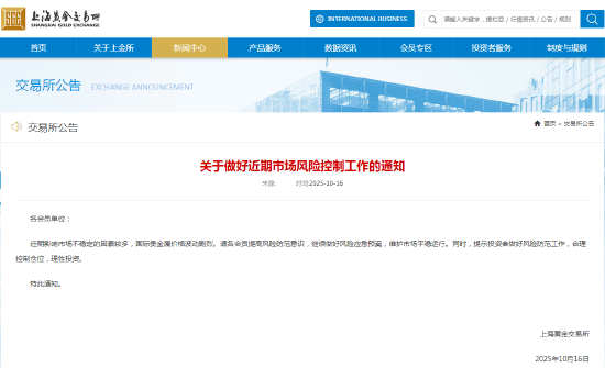 正文 上海黄金交易所:做好近期市场风险控制工作 21资料 V管理员 /2025-10-16 14:15:18 /0 评论 /2 阅读 1016 专题:专题|续创新高!现货黄金突破4200美元 关于做好近期市场风险控制工作的通知 各会员单位: 近期影响市场不稳定的因素较多,国际贵金属价格波动剧烈。请各会员提高风险防范意识,继续做好风险应急预案,维护市场平稳运行。同时,提示投资者做好风险防范工作,合理控制仓位,理性投资。 特此通知。 上海黄金交易所 2025年10月16日