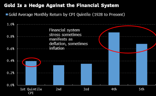 如果按照传统看法,黄金只是通胀对冲工具,那么上图中的柱线应当从左往右逐步变高,因为更高的通胀理应使黄金带来更好的回报。但事实相反:当通胀非常低以及非常高时,黄金的表现都最好。
