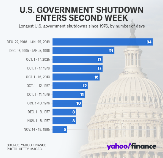美国政府停摆周五已进入第 17 天,目前仍看不到结束迹象,此次停摆已与历史上其他几次停摆并列成为美国联邦政府停摆时长第三长的事件。