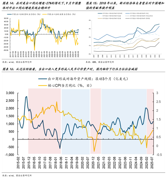 从外贸数据来看,虽然9月中国对美国出口金额同比增速处于-27%的历史低位,但是我国整体对外出口金额反而在9月企稳回升,由4.3%上行至8.3%,表明我国出口对美国的依赖度正在降低,也意味着美国以外的地区制造业活动与实物消费正在增加。同时,趋势上,中国与新兴国家的贸易关系也在变得更为密切,自2018年特朗普第一任期内推动中美贸易战以来,新兴经济体自身需求对中国增加值的贡献率有明显提升。随着美联储开启降息周期,新兴市场制造业活动的修复为我国带来的需求或是未来经济亮点所在。此外,从过往经验来看,当有更多的出口收入通过结汇的方式转化为以人民币计价的资产时,国内物价下行的压力多会出现缓解;因此,如果海外市场确实因为金融系统潜在不稳定性等原因出现大幅调整的话,那么相应也会促进未结汇资金更多回流国内,对国内经济基本面的改善形成一定支撑。