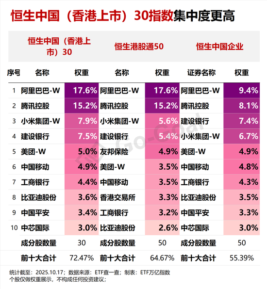 从前十大权重来看,恒生中国(香港上市)30指数的集中度更高,前十大权重占比72.5%,超过恒生港股通50指数的64.7%和恒生中国企业的55.4%,也就是说,资金容纳能力较强,大额交易冲击成本较低。