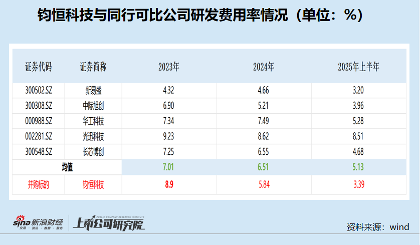 2023年,钧恒科技的研发费用率还高于同行均值,2024年变为低于同行均值,2025年上半年显著低于同行均值。尤其是,2024年标的公司营收大增,但研发费用几乎没有增长。