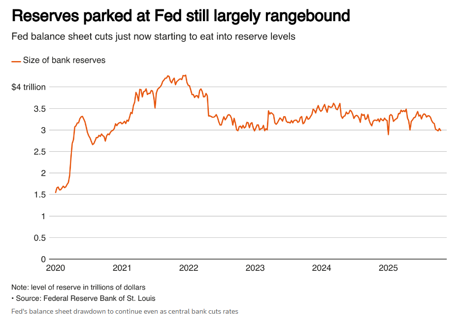 不过,由于难以精准判断“符合美联储标准的货币市场流动性规模”,仍有观点认为QT仍有延续空间。尤其是目前银行准备金水平保持稳定,且QT至今主要消耗的是美联储逆回购工具中的过剩流动性。从数据来看,银行准备金规模虽有下降,但一段时间以来始终维持在接近3万亿美元的水平。
