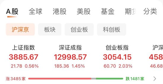 早盘,三大指数集体高开,沪指高开0.18%,深成指高开0.52%,创业板指高开0.81%。截至发稿,指数走强,创业板指拉升涨2.03%,沪指涨0.56%,深证成指涨1.45%。深地经济、油气、工程机械、果链等方向涨幅居前,全市场上涨个股近3500只。