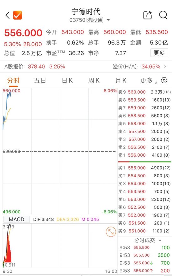 宁德时代AH股联袂上涨,截至发稿,宁德时代A股涨3.32%,报378.67元/股,宁德时代H股涨逾5%,报556港元/股。