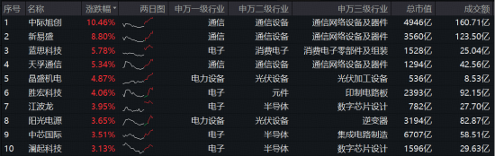 成份股方面,光模块三巨头领衔大涨,中际旭创涨超10%,新易盛涨逾8%,天孚通信涨超5%。消费电子龙头蓝思科技涨超5%,光伏龙头晶盛机电涨超4%,权重股宁德时代、中芯国际涨超3%。