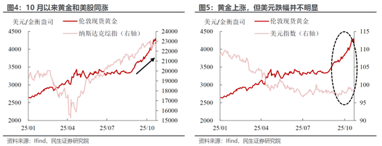 如果说之前的上涨,市场还可以用美联储顶着通胀的过度宽松预期、美元信用以及政府关门来解释,但是最近一两周黄金和股票等风险资产同涨,并且丝毫不惧美元的反弹,这多少有些颠覆了传统的逻辑。