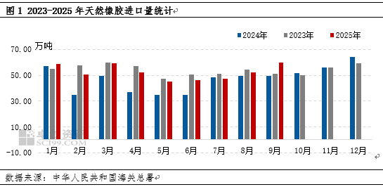 据中华人民共和国海关总署最新统计数据显示9月中国进口天然橡胶总量59.59万吨,同比增长21%;1-9月累计进口量471.72万吨,同比增长77.51万吨,涨幅19.66%。从近三年的天然橡胶进口数据来看,不同于2024年天然橡胶减量明显,2025年由于上一割胶季产量补充以及四季度船货预售支撑下,今年上半年天然橡胶进口量同比增长26%以上。同时国内需求韧性支撑,以及国际市场需求低迷、EUDR分流边际走弱,从而支撑国内进口水平整体实现恢复性增长趋势。