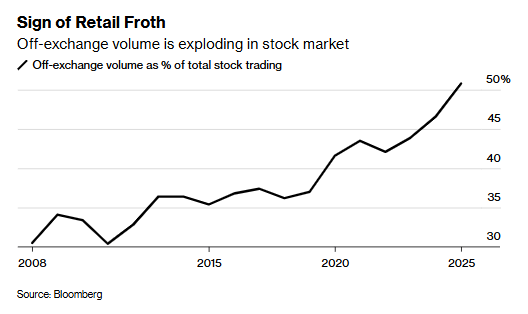 衡量散户参与度的一个指标是通过场外渠道(如为Robinhood(HOOD.US)等平台服务的股票批发商运营的场所)执行的股票交易量。数据显示,这类交易今年预计将首次占到总交易量的50%。