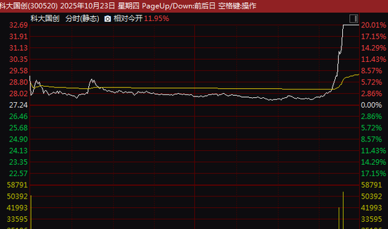 量子科技概念股尾盘快速拉升,板块指数由跌逾1%直线拉至涨逾2%,几乎以全天最高点收盘。科大国创(300520)在临近收盘最后10几分钟垂直拉升至20%涨停,达华智能(维权)、神州信息同步直线涨停,辰光医疗、迪普科技、国盾量子等尾盘也出现异常上涨走势。