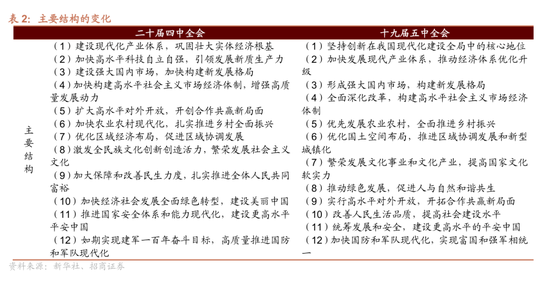 在主要结构方面,相较于十九届五中全会公报,本次公报仍然保留了12大要点,不过顺序有所调整。其中,对外开放、民生、现代化产业体系的排序均有所上调,尤其是对外开放。其从此前的第9为提升至了本次的第5位,排序大幅跃升标明了,后续我国将持续扩大对外开放的决心。