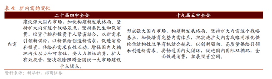 在扩内需方面,相较于十九届五中全会,本次公报有两大变化。一是提到了“坚持惠民生和促消费、投资于物和投资于人紧密结合”,这意味着已经基本确立了通过惠民生来扩内需的这一根本路径。二是对“统一大市场”的措辞更加坚决。在此前的十四五规划中,对“统一大市场”用到的是“加快构建国内统一大市场”,本次则是变为了“坚决破除阻碍全国统一大市场建设卡点堵点”。