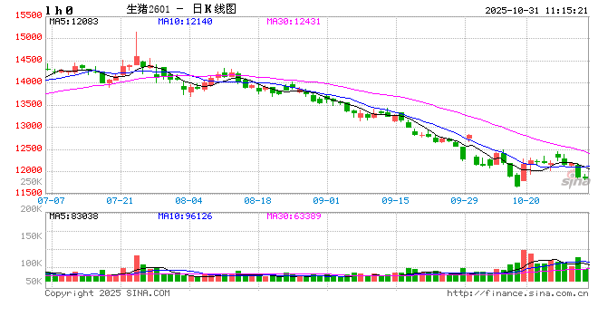 期货方面,昨日收盘生猪 2601合约11880元/吨,较前交易日变动-305.00元/吨,幅度-2.50%。现货方面,河南地区外三元生猪价格12.49元/公斤,较前交易日变动-0.14元/公斤,现货基差 LH01+610,较前交易日变动+165;江苏地区外三元生猪价格 12.71元/公斤,较前交易日变动-0.05元/公斤,现货基差LH01+830,较前交易日变动+255;四川地区外三元生猪价格12.30元/公斤,较前交易日变动-0.03元/公斤,现货基差LH01420,较前交易日变动+275。