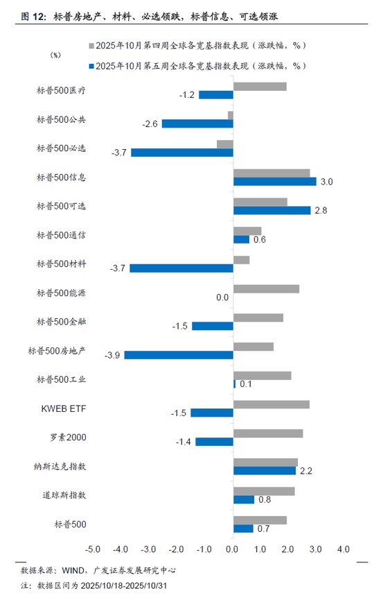 MSCI发达市场、新兴市场涨幅收窄,分别收涨0.61%、0.92%。美股AI叙事有所松动但根基仍在,纳指、标普500、道指周涨2.24%、0.71%、0.75%。鲍威尔暗示12月降息未定,受利率更为敏感的中小盘代表罗素2000先扬后抑制,回调1.4%。中概股KWEB ETF受到国内股市联动影响,同样回调约1.5%。标普行业分化显著,信息、可选表现亮眼,但公共、金融、必选、材料、地产均偏弱运行。大型科技股(TAMAMA科技指数)与费城半导体指数分别上涨4.11%、3.61%。Meta财报亮眼但10月30日单日下跌超11%,激进资本支出计划与巨额税费引发市场担忧。美股波动率VIX指数先下后上,回到17.44%,VVIX指数同样升至104.46,提示市场对后市波动隐忧渐起。