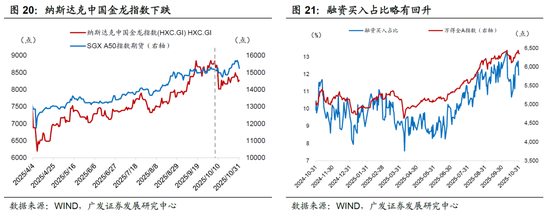 四是中国资产方面,赔率发挥定价权。股债显著跷跷板,大盘冲高转震荡。全周万得全A震荡收涨0.41%,10年期国债利率下行5.32BP至1.80%。两市成交额有所恢复,放量至日均2.3万亿元,周环比29%,但仍低于9月水平。融资买入占比亦重拾上行态势,日均11.95%。海外中概股与港股相较A股更显弱势。纳斯达克金龙指数周跌1.05%;恒科、恒指分别回踩2.51%、0.97%。