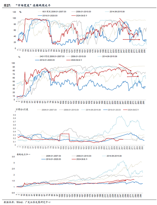 观察市场的广谱性。在“价”上“市场宽度”连续两周走平,万得全A指数成分股中各成分股超越股票自身240日均线的占比维持在73.5%左右;超60日、20日均线占比同样维持在47.10%%、56.5%。在“量”上,市场集中度一波三折,A股成交额前5%的个股成交额占全部A股比重小幅回升至42.9%,但仍低于9月极致状态。