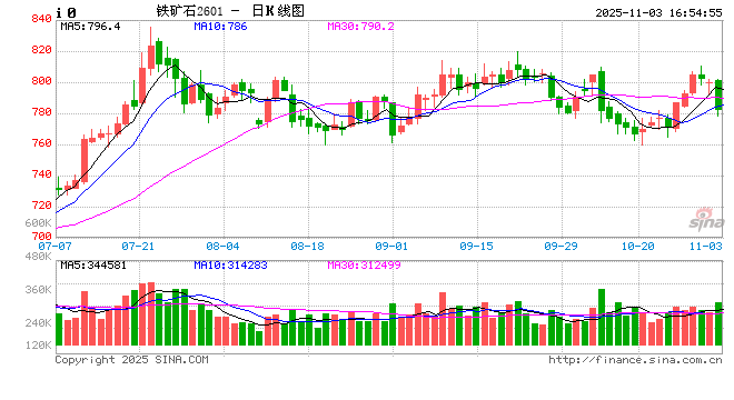 周一,铁矿盘面价格大幅走弱,回吐上周涨幅,日内最大跌幅超2%。终端层面来看,11月螺纹需求将逐步转入消费淡季,多地以旧换新政策调整对汽车、家电等耐用品销售将有一定影响,热卷需求也将受到一定影响。预计11月钢材需求整体将有所走弱,对上游铁水产量存在压制。此外,上周唐山限产进一步抑制了钢厂对上游炉料端的采购行为,料短期铁矿石价格或承压。不过从政策角度看,上周中美元首在釜山会晤,贸易谈判缓和了市场宏观情绪,美联储降息符合市场预期,年底宏观政策高发,市场情绪仍以乐观基调为主,铁矿虽存走弱预期,但大跌概率或较低。