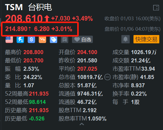 正文 台积电盘前涨3% 台股、美股夜盘均创新高 多家大行齐唱好 21资料 V管理员 /2025-01-06 19:20:02 /0 评论 /17 阅读 0106 格隆汇1月6日|台积电(TSM.US)美股盘前涨3%报214.89美元。消息上,台积电今日在台湾股市创出1025元新台币的历史新高位,在美股市场的夜盘交易时段亦创历史新高。 2025年华尔街继续看好台积电,大摩认为,台积电通常在年初给出保守预期,然后超额完成预期。瑞银指出,在高性能计算和云AI需求的强劲带动下,台积电2025年全年营收有望实现25%的显著增长。高盛预计,2025年第一季度台积电营收环比将仅下降2.2%,为较为乐观的大型投行之一。(格隆汇)