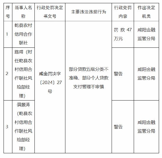 正文 乾县农村信用合作联社被罚47万元:因部分贷款五级分类不准确 部分个人贷款支付管理不审慎 21资料 V管理员 /2025-01-06 19:25:02 /0 评论 /62 阅读 0106 1月6日金融一线消息,国家金融监督管理总局咸阳监管分局行政处罚信息公开表显示,乾县农村信用合作联社因部分贷款五级分类不准确、部分个人贷款支付管理不审慎,被咸阳金融监管分局罚款47万元;路甫(时任乾县农村信用合作联社风险部经理)、俱景涛(乾县农村信用合作联社风险部经理)二人被监管警告。
